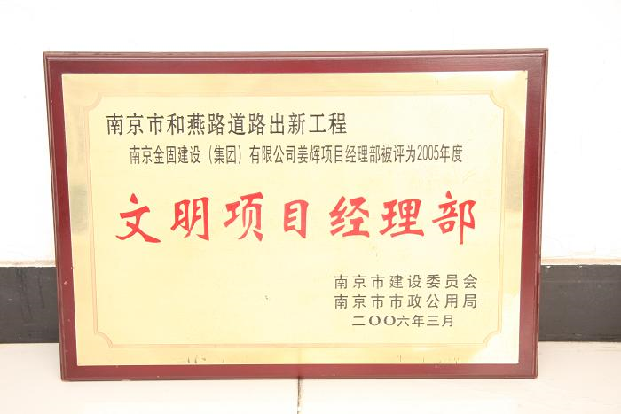 和燕路道路整治出新工程獲得南京市建委、市政公用局頒發(fā)的“市級文明工地”獎,同時該工程還被市建委、市政公用局評為“文明項目經(jīng)理部”