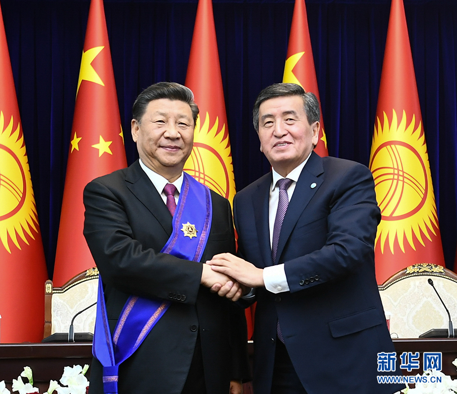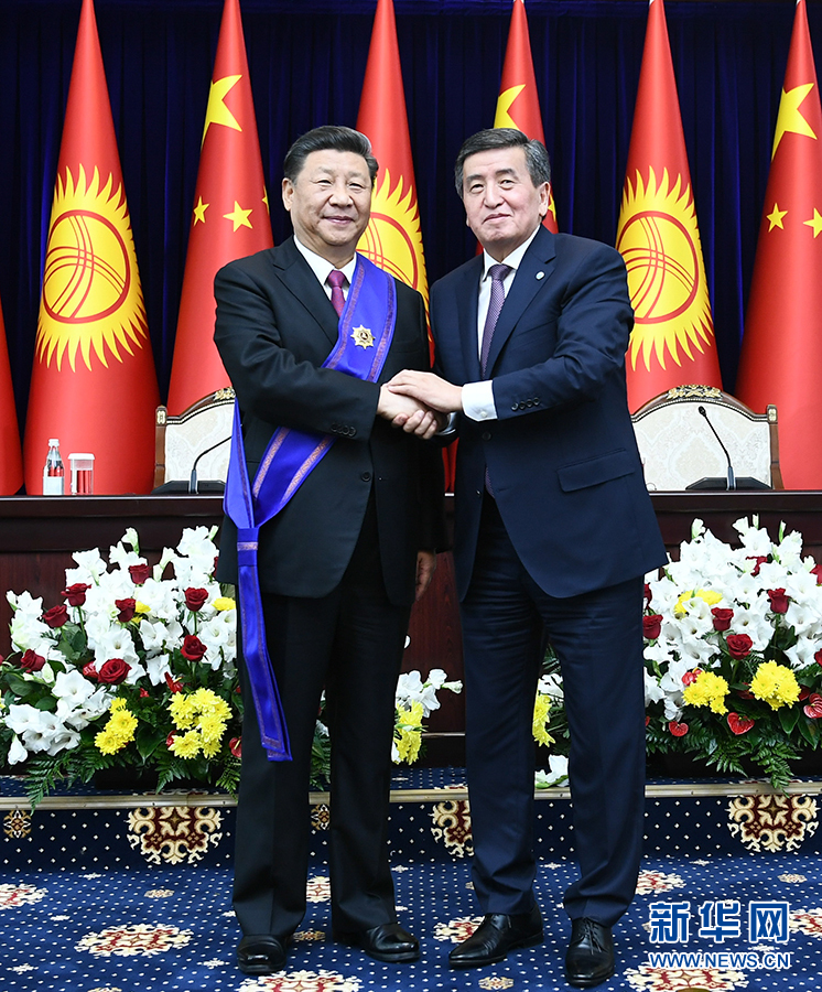 6月13日,國家主席習近平在比什凱克出席儀式,接受吉爾吉斯斯坦總統(tǒng)熱恩別科夫授予“瑪納斯”一級勛章。