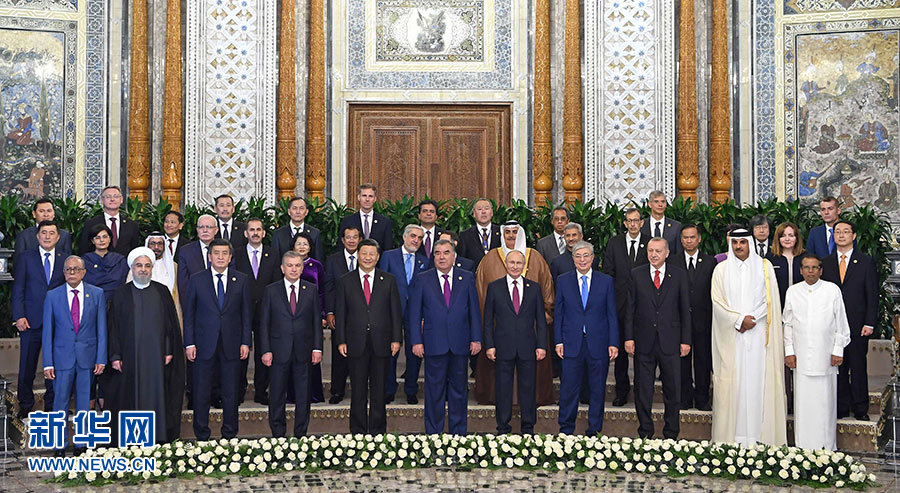 6月15日,亞洲相互協(xié)作與信任措施會議第五次峰會在塔吉克斯坦首都杜尚別舉行。國家主席習(xí)近平出席峰會并發(fā)表重要講話。這是出席會議的亞信成員國領(lǐng)導(dǎo)人或代表,觀察員國代表以及有關(guān)國際和地區(qū)組織代表集體合影。 新華社記者 張領(lǐng) 攝