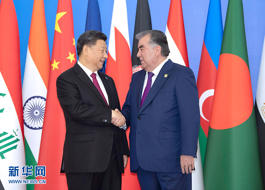 6月15日,亞洲相互協(xié)作與信任措施會議第五次峰會在塔吉克斯坦首都杜尚別舉行。國家主席習(xí)近平出席峰會并發(fā)表重要講話。這是習(xí)近平抵達(dá)納烏魯茲宮迎賓廳,受到塔吉克斯坦總統(tǒng)拉赫蒙熱情迎接。 新華社記者 沙達(dá)提 攝